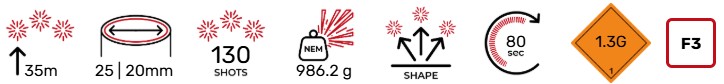Caesar ist eine Feuerwerkskombo, Showfeuerwerksbatterie mit 130 Auswürfen, V- und flacher Form, Kombinationen aus 20 und 25 mm Kaliber, erreicht eine Höhe von 35 Metern und hält 80 Sekunden.