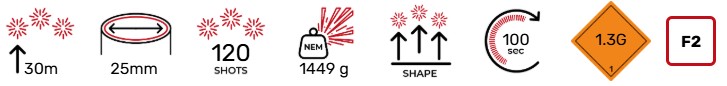 Das Imperial Pyro Show Feuerwerk ist ein zusammengesetztes Feuerwerk mit 120 Auswürfen, flacher Form, Kaliber 25 mm und einer Höhe von bis zu 35 m!