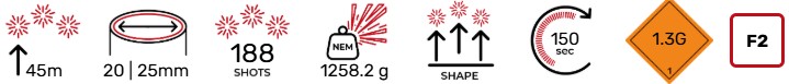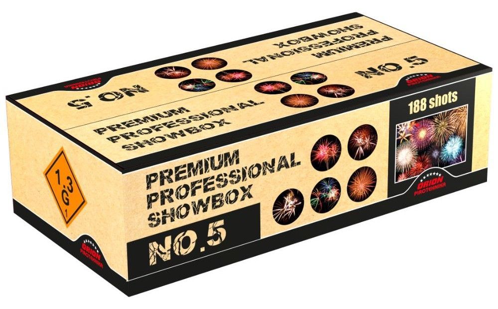 No. 5 Fireworks ist ein Verbundfeuerwerk mit 188 Auswürfen, flacher Form, Kaliber 20 – 25 mm, erreicht eine Höhe von 45 m und dauert 150 Sekunden!