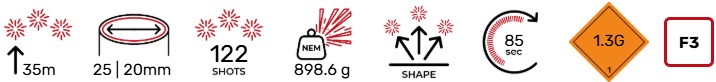 Die Revolution ist eine Feuerwerkskombination mit 122 Abgüssen, V- und Flachform, einer Kombination aus Kalibern 20 und 25 mm, erreicht eine Höhe von 35 m und hält volle 85 Sekunden an.
